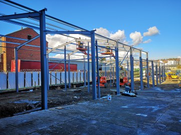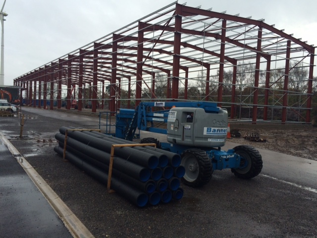 We have recently supplied and erected a new steel portal frame building to accommodate further expansion for GBuk Limited a medical supplies company based at Blackwood Hall Business Park. The building measured 21.500m wide x 102m long in 17 equal bays at 6.000m each . The eaves hieght was 10m. The building was clad in Kingspan Composite Panels.
